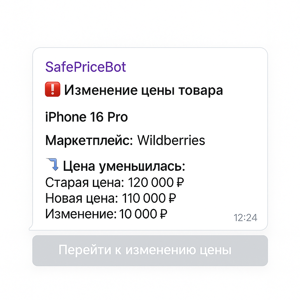 Цена изменилась — вы получаете сообщение в Telegram. Реагируйте вовремя, меняйте цену и не теряйте прибыль.