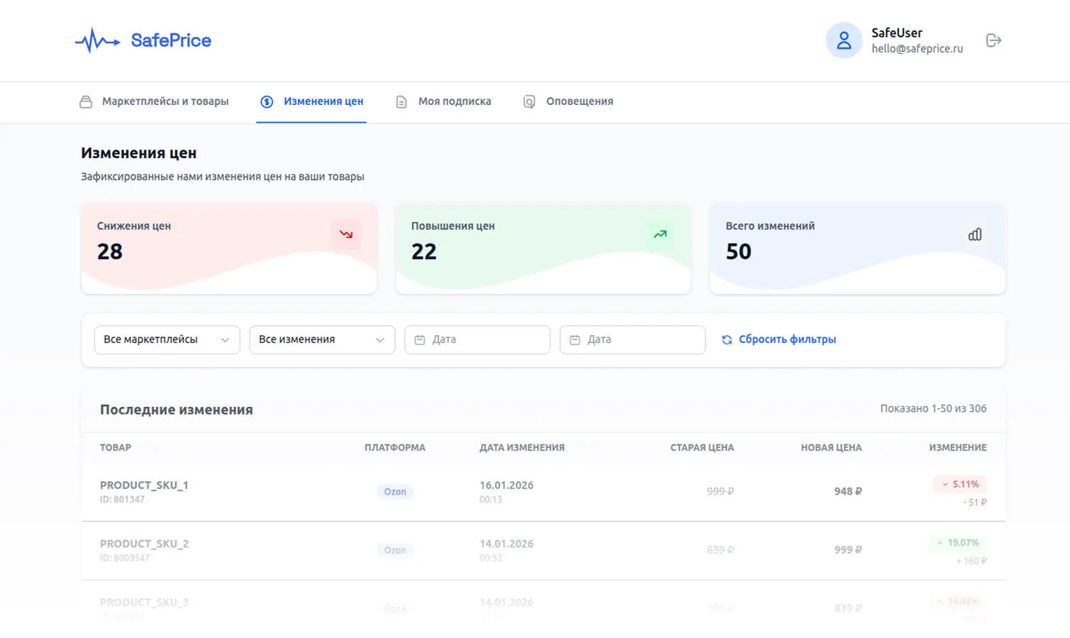 SafePrice автоматически отслеживает цены ваших товаров на Ozon и Wildberries. Вы просто добавляете API-ключ, сервис синхронизирует товары и начинает мониторинг. При любом изменении цены вы мгновенно получаете уведомление.